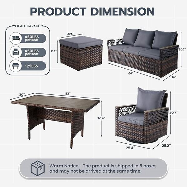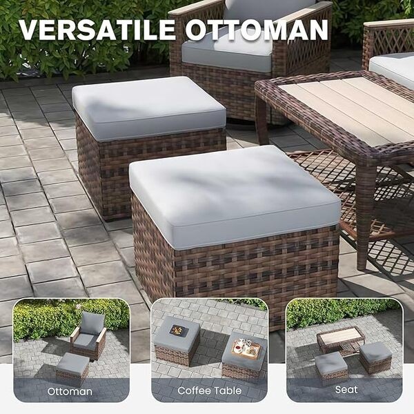 Ottomans for Added Relaxation and Flexibility: Included ottomans complement the wicker chairs and sofa, offering extra seating or footrest options. This flexible design lets you customize your patio setup for relaxation or socializing.