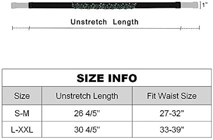 • S-M (27-32"):Relaxed without stretch length 25.6" /Maximum stretching length :37" . Waist Range: 25.6" to 37",Recomend Waist 27~32".