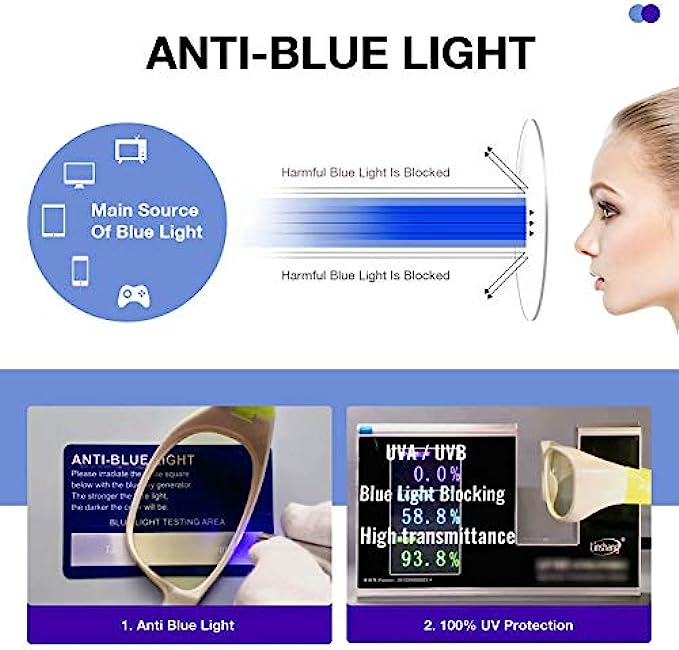 • EXCLUSIVE PATENT TAC LENS - High Transmittance, Low Color Aberration. Exclusive patent layers lamination technique with slight tinted lenses, cuts High-Energy Blue Light to minimize Digital Eye Strain. TAC lens can not only block harmful blue ray, 99.9% UVA & UVB Protection, also with 93% high transmittance, providing a prefect BLANCE between eye protection and visual experience.