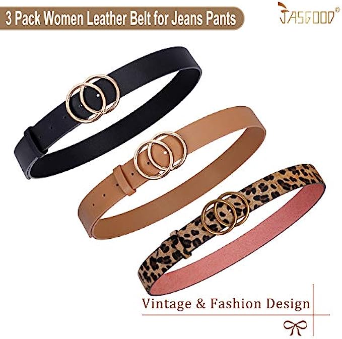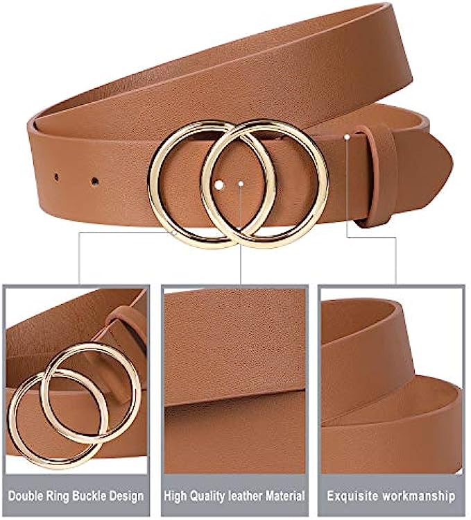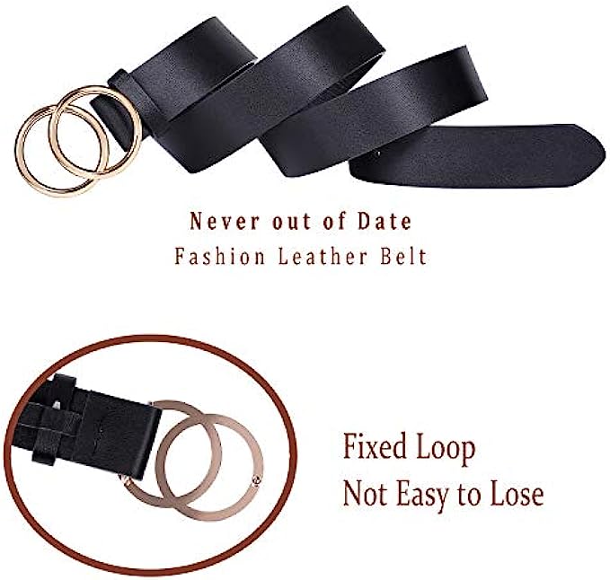 100% Leather Double Ring closure ❤Design---The vintage double-loop clasp blends perfectly with the western design,it will make your outfit look very distinctive.Vintage delicacy belt buckle will make you stand out from the crowd,comfortable to wear and stylish. ❤Material---This women leather belt was made of high quality leather,soft and comfortable on your dresses.Durable and sturdy leather belt can be used for years.The belt is not pin buckle belt, it’s easy to wear and take off. ❤Outfits---The women belts can be worn with any pair of jeans,dresses,or overcoats,which suitable for your wear in any season and all occasions.There are three color belt in one package,It gives you a different choice. ❤Size--- The jeans belt perfect for pants size 23"-27"/28"-33"/35"-39"/40"-44". A puncher enclose in the package for you to DIY trim or punching with our instructions if the size not fit you well. ❤Gift---The leather belt as wonderful gift for families and friends on birthday ,thanksgiving day, Christmas,and other anniversary.