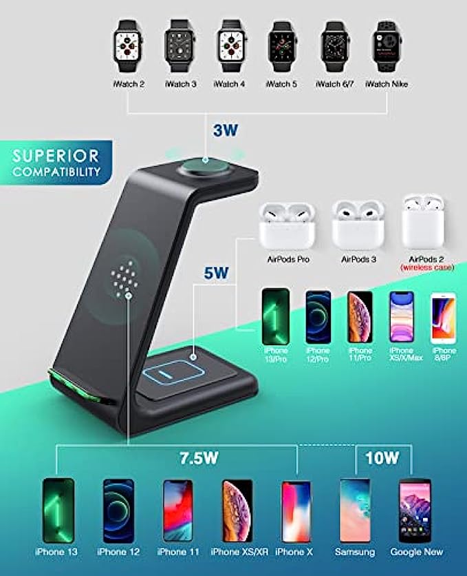 Wireless Charging Station,3 in 1 Fast Charging Station,Wireless Charger Stand for iPhone 13/12/11 Pro Max/X/Xs Max/8/8 Plus, AirPods 3/2/pro, iWatch Series 7/6/5/SE/4/3/2, and Samsung Phones