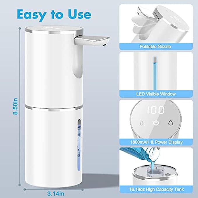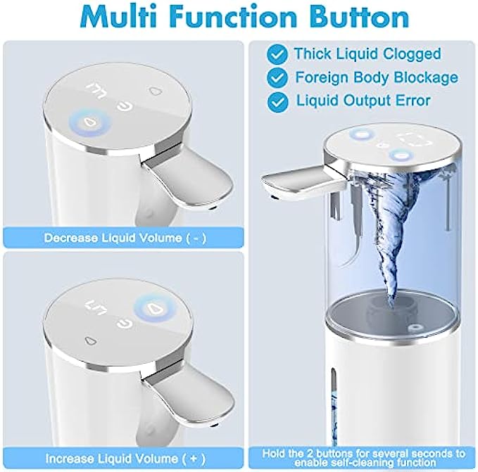 HIGH COMPATIBILITY AND LARGE CAPACITY: The large 16.37 oz bottle is compatible with many detergents. If you use various liquids such as body wash, cleanser, facial cleanser. Bright LED lights and a visible window allow you to see how much soap is left.