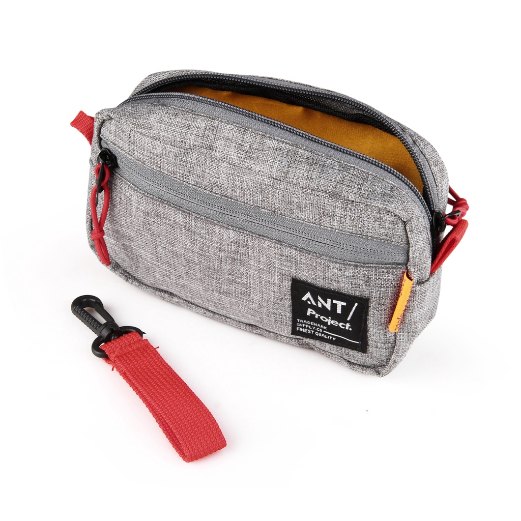 Colour:grey Material Quality:good Smaller than usual mini pouch. Comes with a red strap. Two inner compartments and one exterior zip pouch. Good quality. Thanks Ant Project.