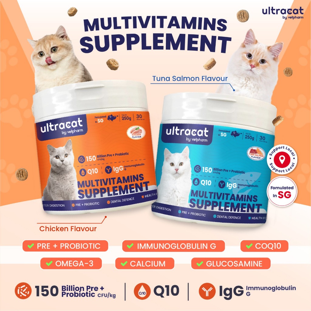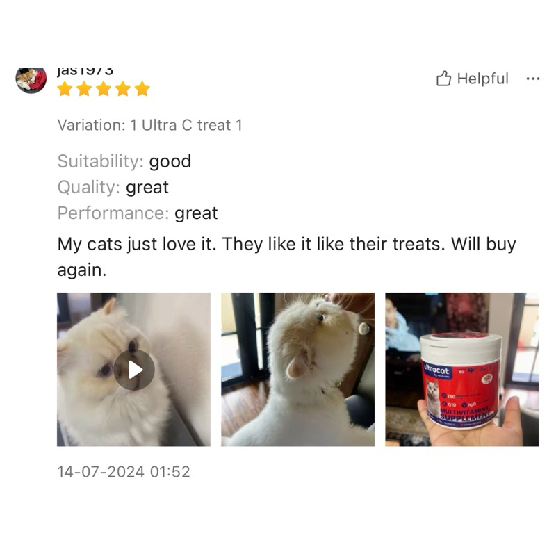 Suitability:good Performance:yet to know Quality:1 I have ordered BetaCats Chicken but the seller msg n inform that it is out of stock now n recommended UltraCat which is better n hvw gd supplements too.I gave a Yes since its frok Chicken too!Let my kitty tried just now n she love it!Hope my cat will put on weight n become groofy after taking this supplements.?